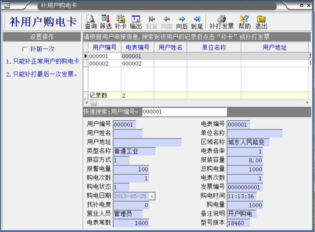 本章節(jié)通過(guò)圖片和文字,詳細(xì)的介紹預(yù)付費(fèi)電表在售電系統(tǒng)補(bǔ)卡的步驟: