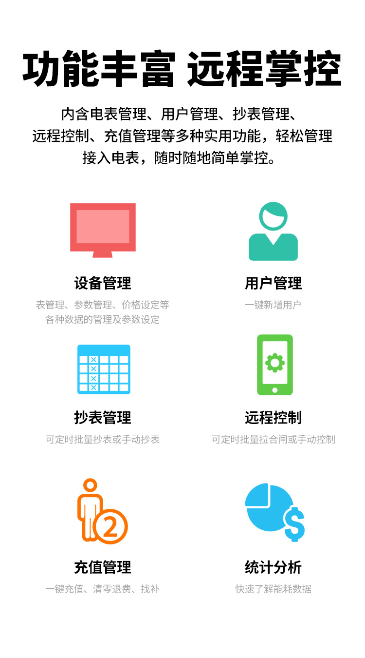 本公司DDSY6111/DDZY6111家用WiFi遠(yuǎn)程智能電表與本公司遠(yuǎn)程抄表系統(tǒng)和手機(jī)APP配套使用,遠(yuǎn)程抄表管理系統(tǒng)具有實(shí)時(shí)抄表、定時(shí)抄表外,還提供了設(shè)備管理功能,如告警、余額短信通知、遠(yuǎn)程充值、手機(jī)抄表、手機(jī)查詢、手機(jī)充值、預(yù)付費(fèi)、后付費(fèi)、自助充值機(jī)充值、遠(yuǎn)程拉合閘、各種查詢報(bào)表、統(tǒng)計(jì)報(bào)表下載等功能。